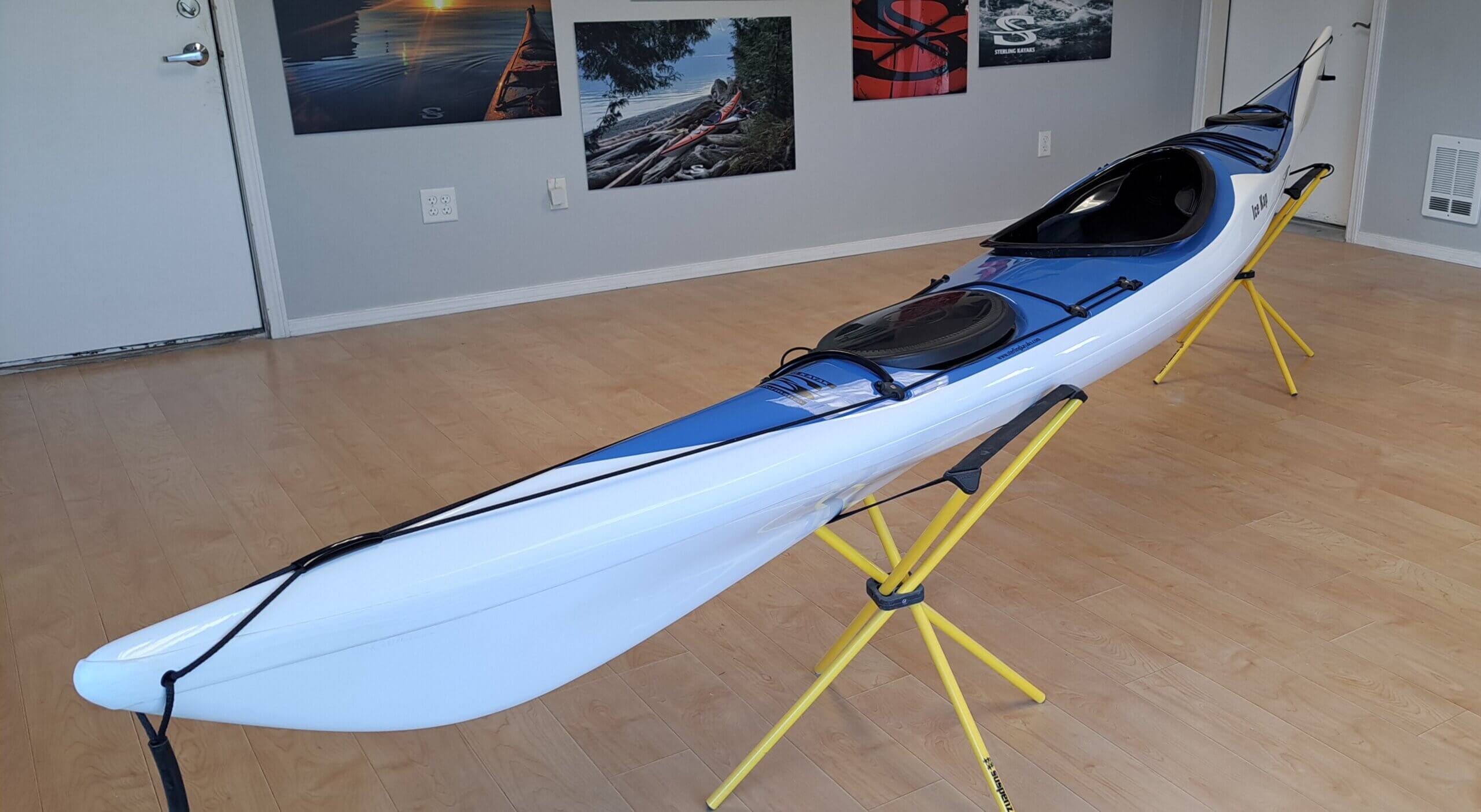 This 2022 Ice Kap has a blue deck, a white hull, and a white hi-line stripe. It is laid-up in carbon fiber.