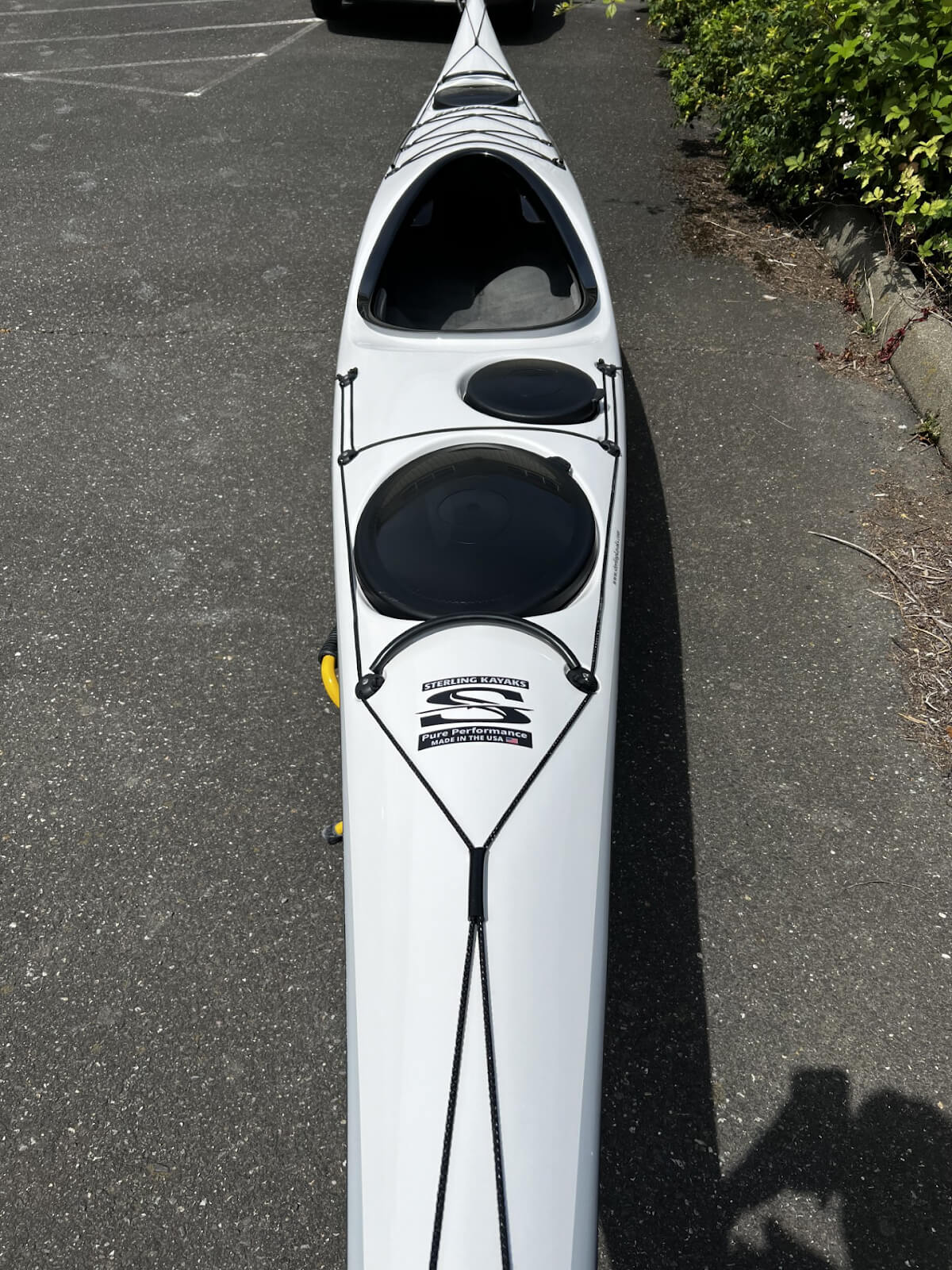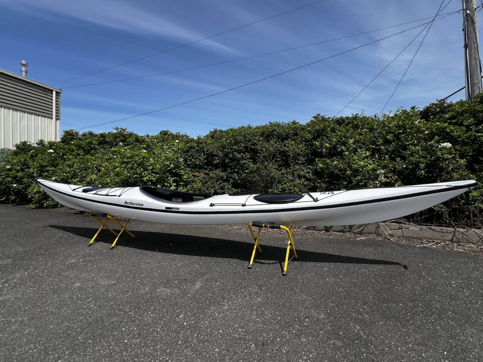 A refurbished 2023 Reflection with a carbon/kevlar layup, a white hull, a gray side wave, a black side seam, and a white hull.